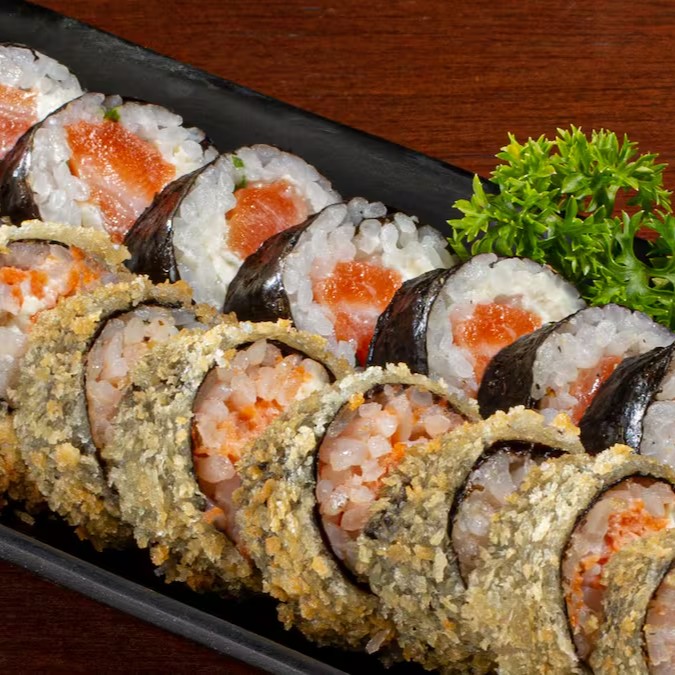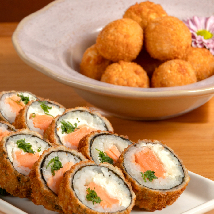 Deliciosos bolinhos crocantes por fora e suculentos por dentro, preparados com peixe ou salmão frescos, arroz temperado e combinações especiais de cream cheese e molhos. Cada mordida oferece equilíbrio perfeito entre crocância, cremosidade e frescor, tornando-os ideais como entrada ou petisco para compartilhar. Uma experiência gastronômica que vai conquistar seu paladar desde a primeira unidade!”