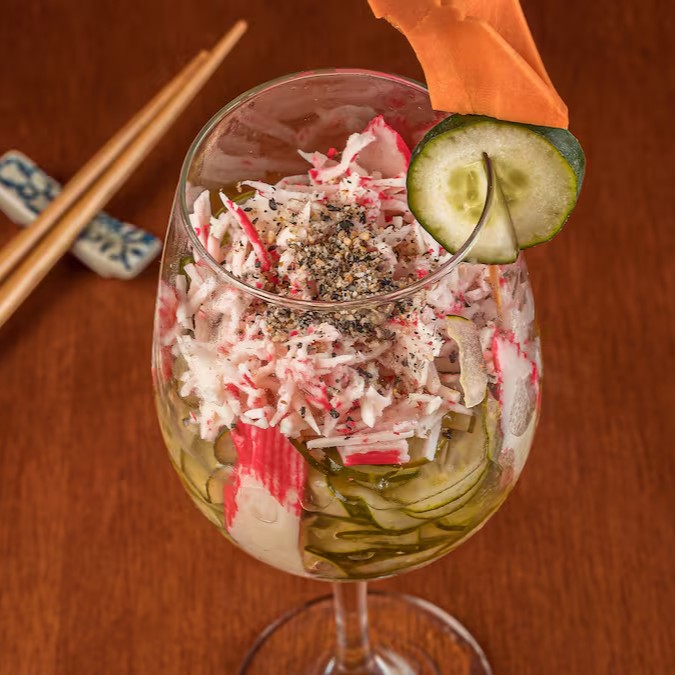 Salada de pepino, kani e gengibre, preparada com pepino fresco, cortado finamente e temperado com um molho delicado, equilibrando acidez e sabor de forma perfeita. Refrescante e saboroso, é a escolha ideal como entrada ou acompanhamento, trazendo um toque leve e sofisticado que valoriza qualquer refeição japonesa.”