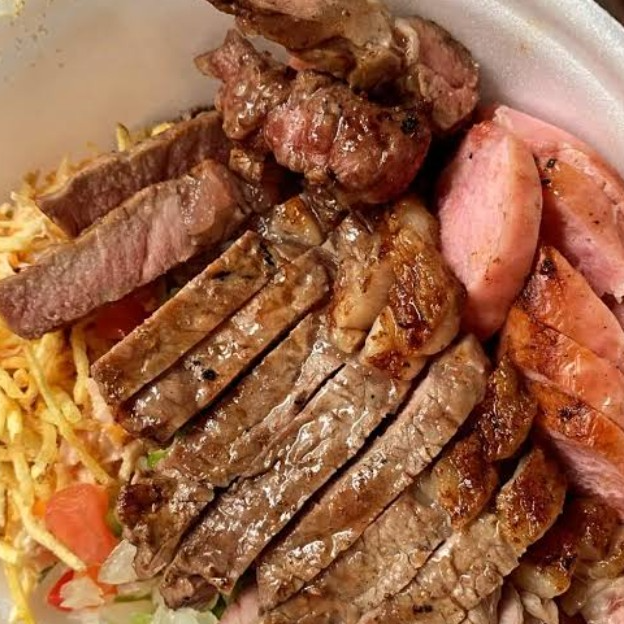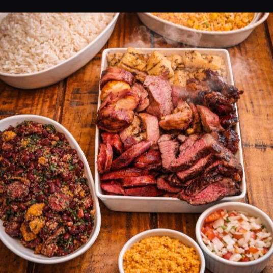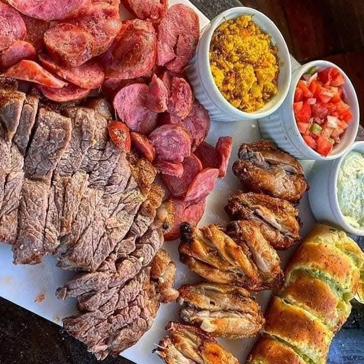 550a600 Gr (mais de meio kilo) de um delicioso churrasco na brasa composto por (picanha suina , filé bovino ao alho , alcatra bovina ,linguiça toscana e de frango , sobrecoxa na brasa e pao ao alho 600gr) acomp: arroz branco soltinho 275gr , salpicao 275gr , vinagrete e farofa..