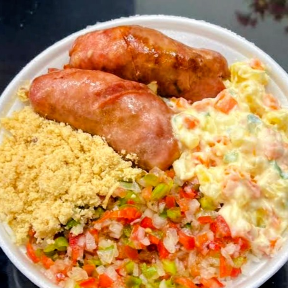 1 embalagem n8G com um delicioso feijão preto , arroz branco soltinho , irresistível salpicão ,molho vinagrete fresquinho e farofa da casa + 2 linguiças de frango na brasa .(Serve bem 1 pessoa)