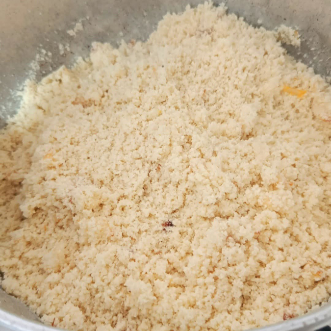250 a 300 gr de uma deliciosa farofa de ovos feita na manteiga.