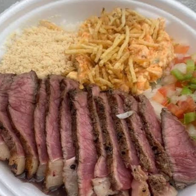 1 embalagem n8G com feijão preto saboroso, arroz branco soltinho, salpicão irresistível, vinagrete fresquinho, farofa da casa + 130 a 150 Gr de uma deliciosa alcatra ao alho.