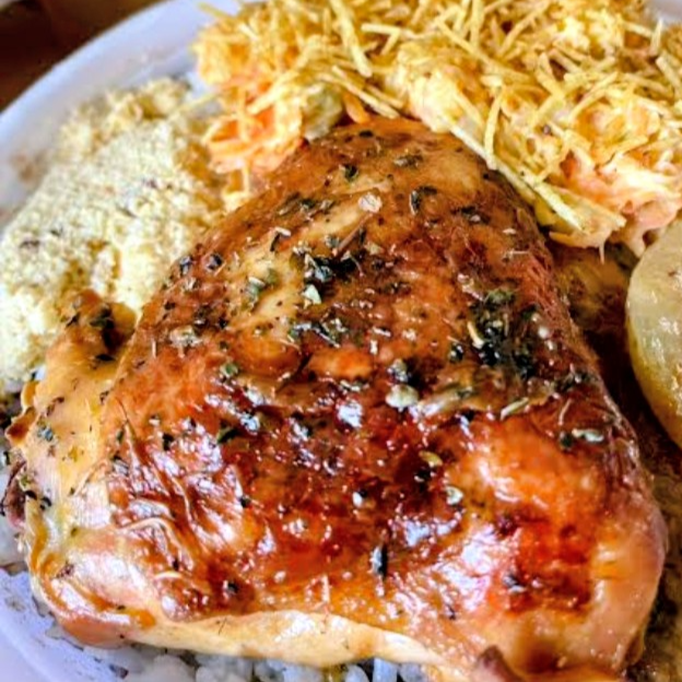 Meio frangão assado na brasa + farofa + 1 linguiça + vinagrete