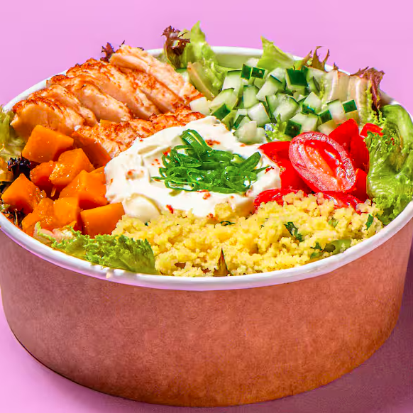 Mix de folhas, frango em tiras, cuscuz marroquino, coalhada temperada, abóbora assada, tomate cereja, pepino, hortelã e cebolinha.