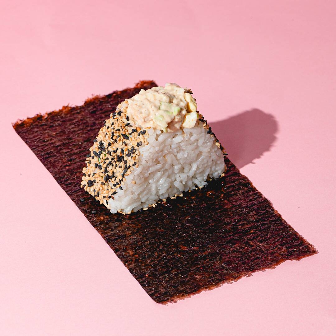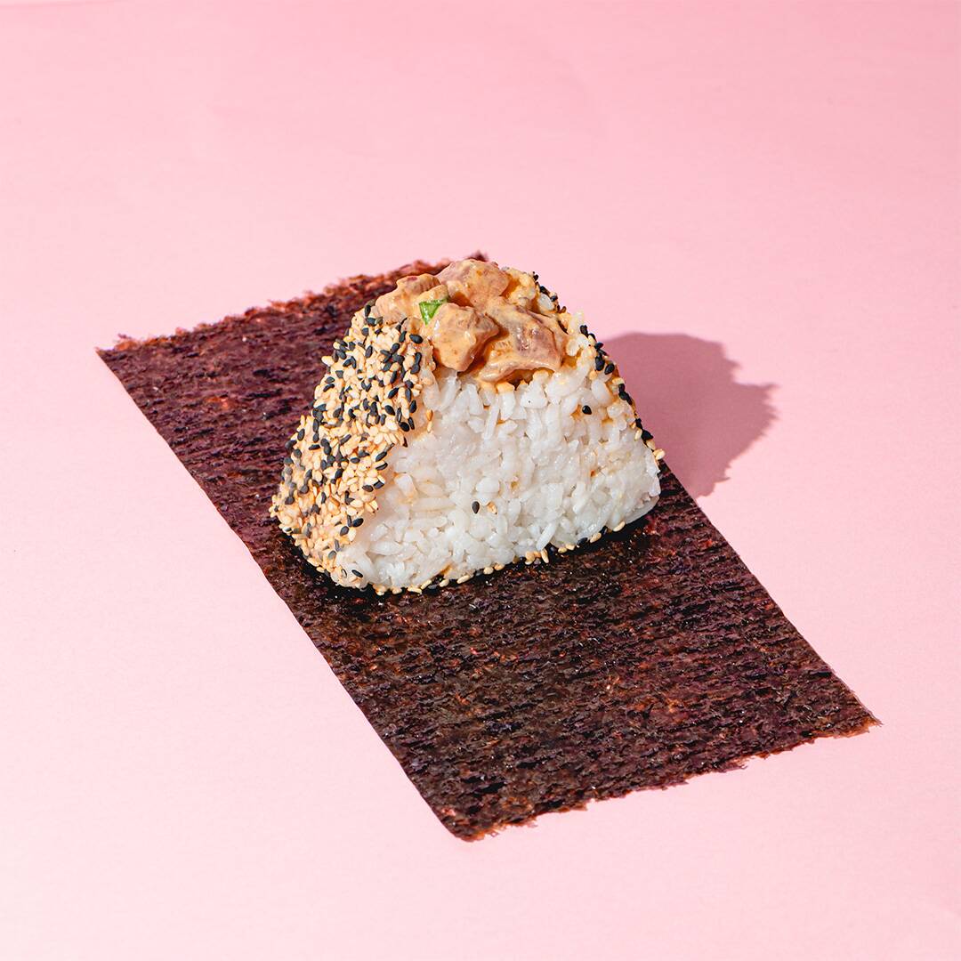 Onigiri Atum Spicy com cebola roxa picada, cebolinha e maionese de katsobushi