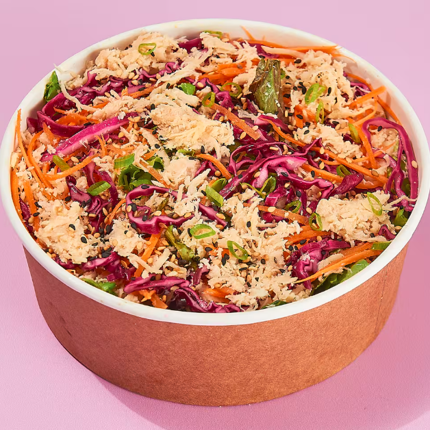 Mix de folhas, frango em pedaços, cenoura, picles de repolho e cebolinha.