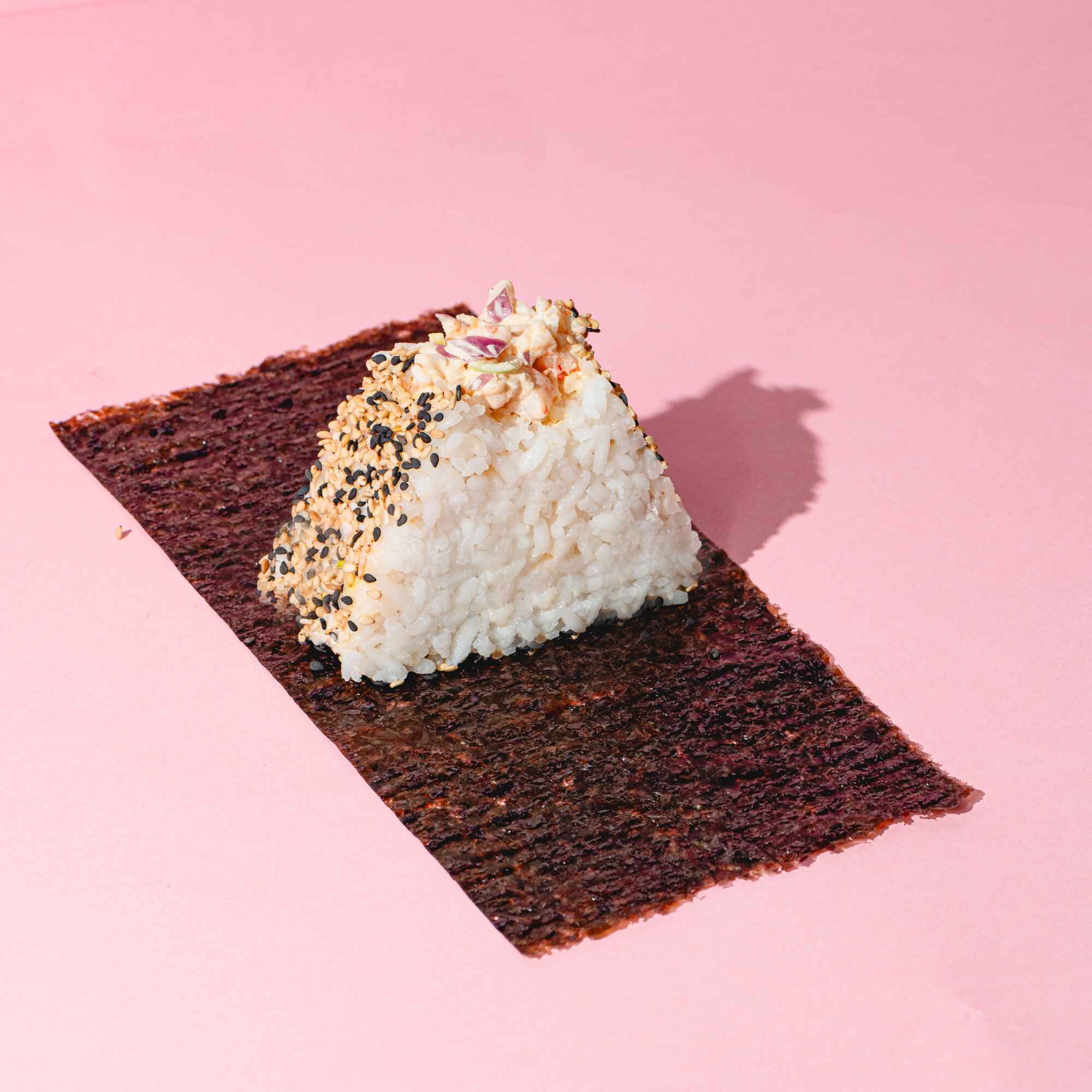 Onigiri Atum Camarão Tartar com cebola roxa com cebola roxa, alho-poró, maionese spicy e um toque de hondashi