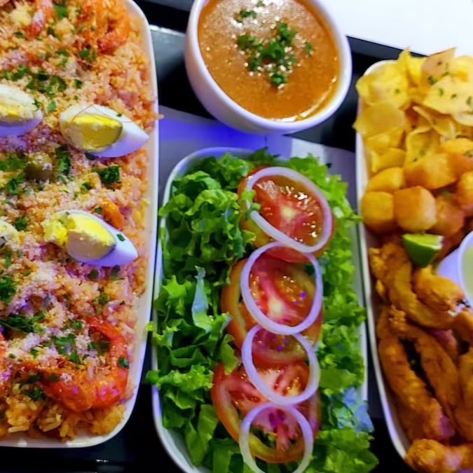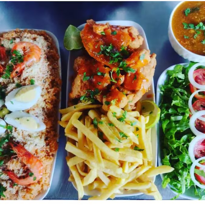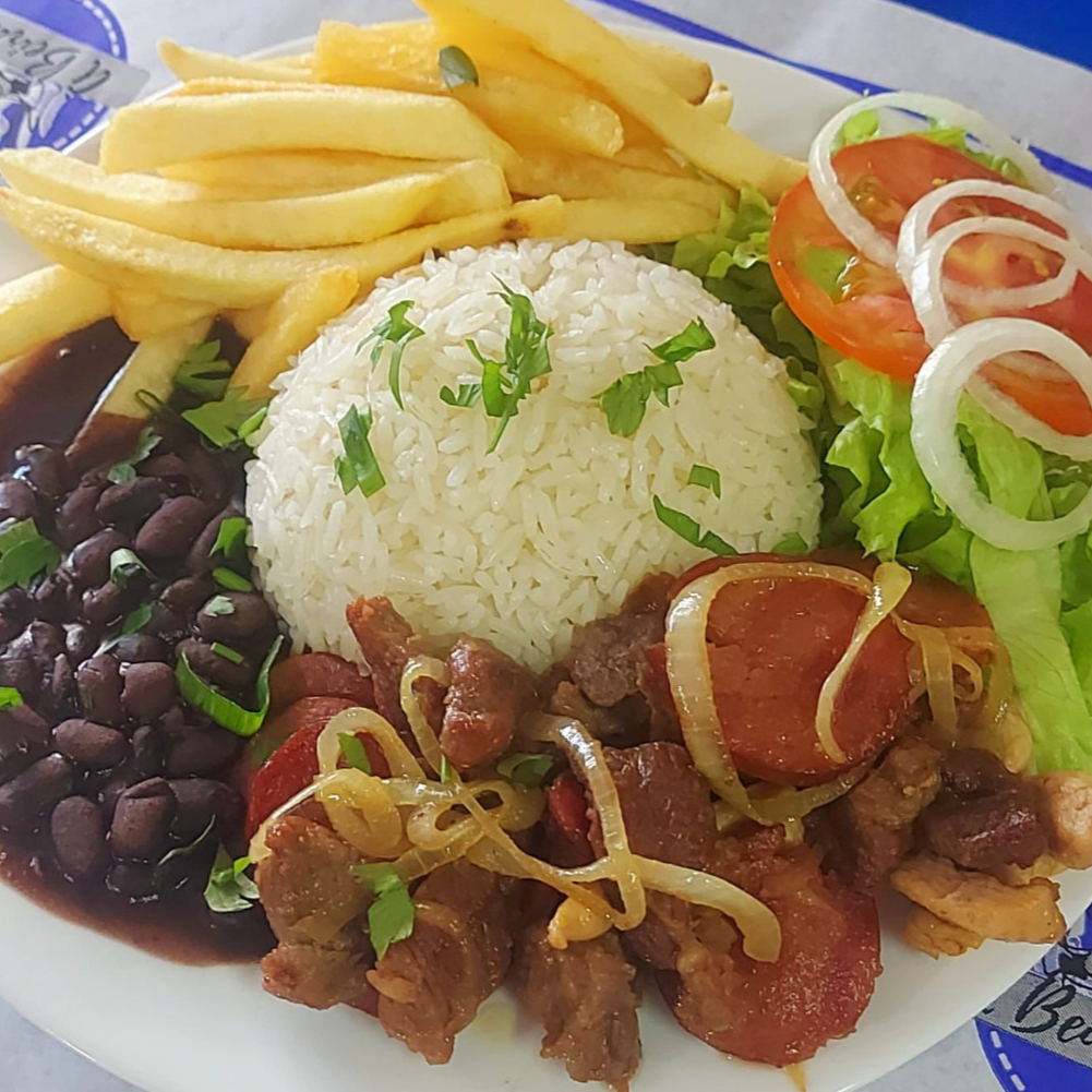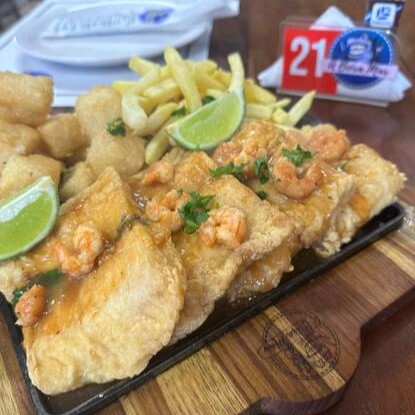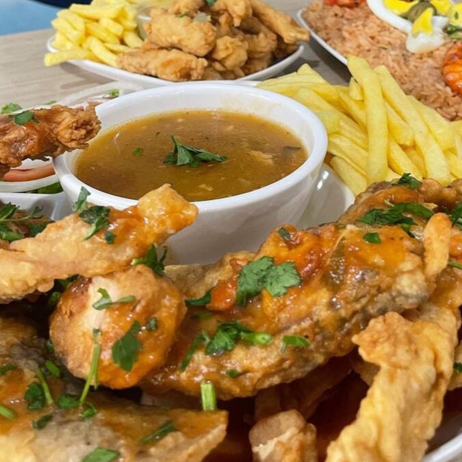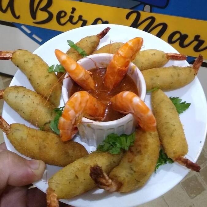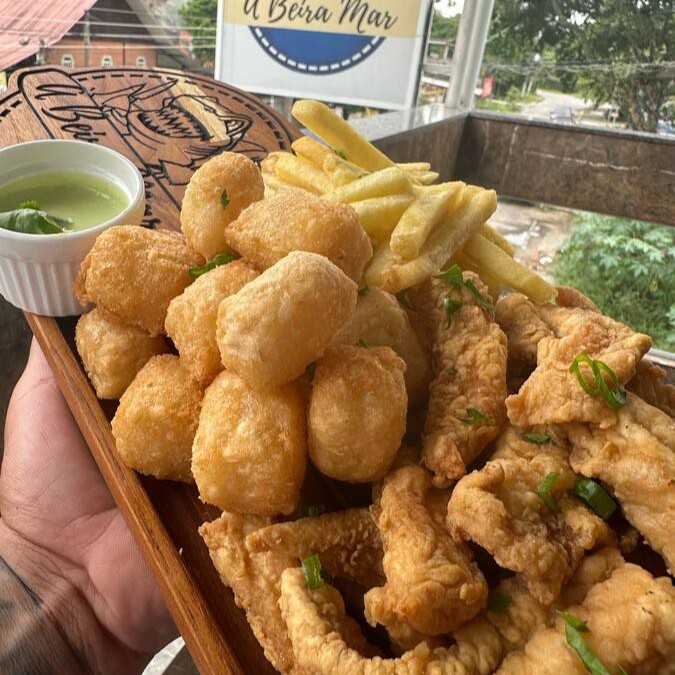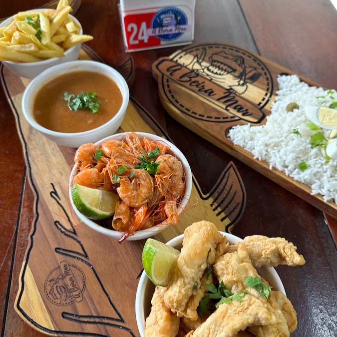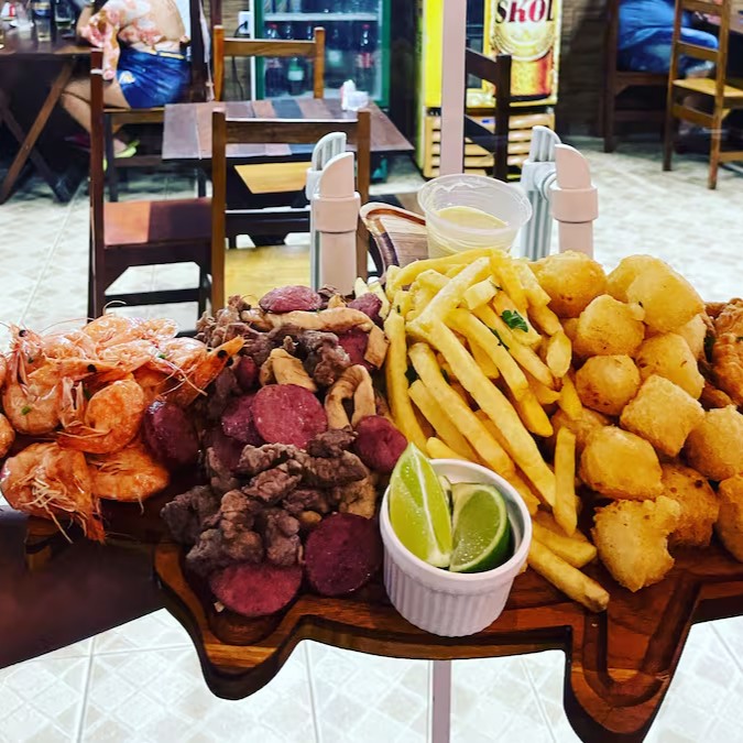 Camarão, isca de peixe, churrasco misto, aipim frito, batata frita e molho especial