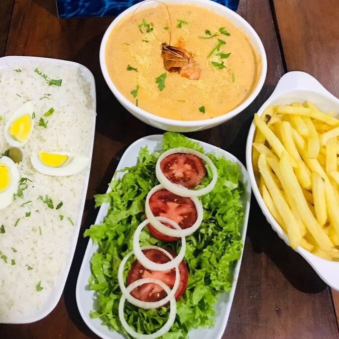 Filé de linguado, molho de camarão, arroz, pirão, aipim ou fritas