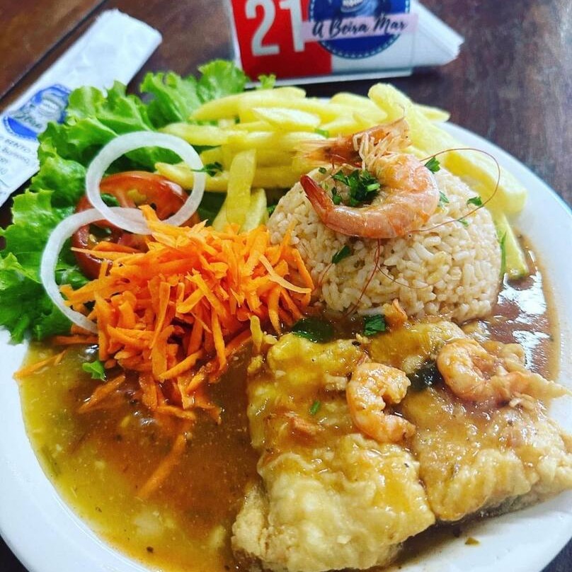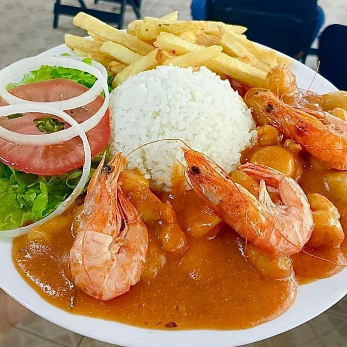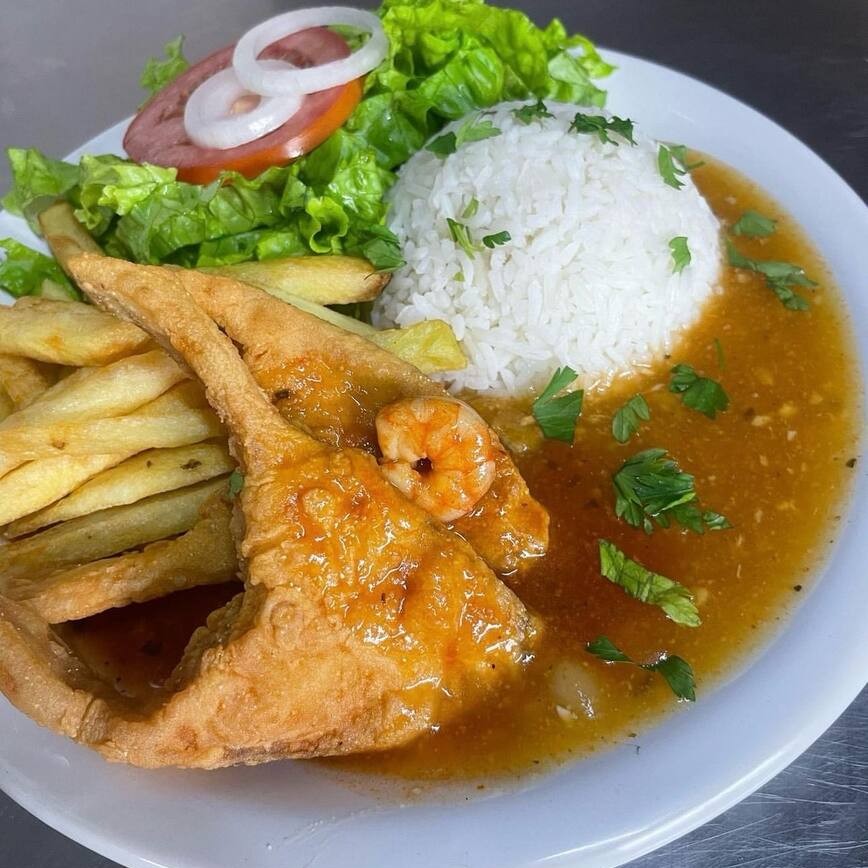 Isca, camarão, fritas, pirão, arroz