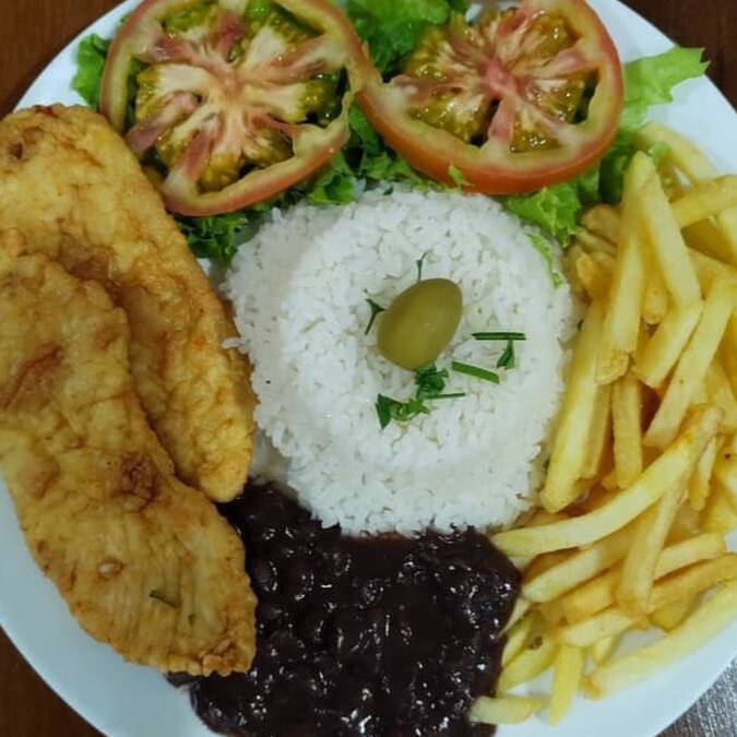 Frango empanado, arroz, feijão , salada e fritas