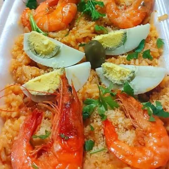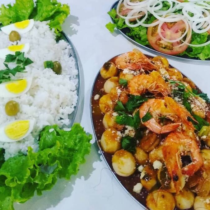 Noque de camarão, arroz, salada