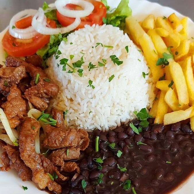Contra filé, arroz, feijão, salada e fritas