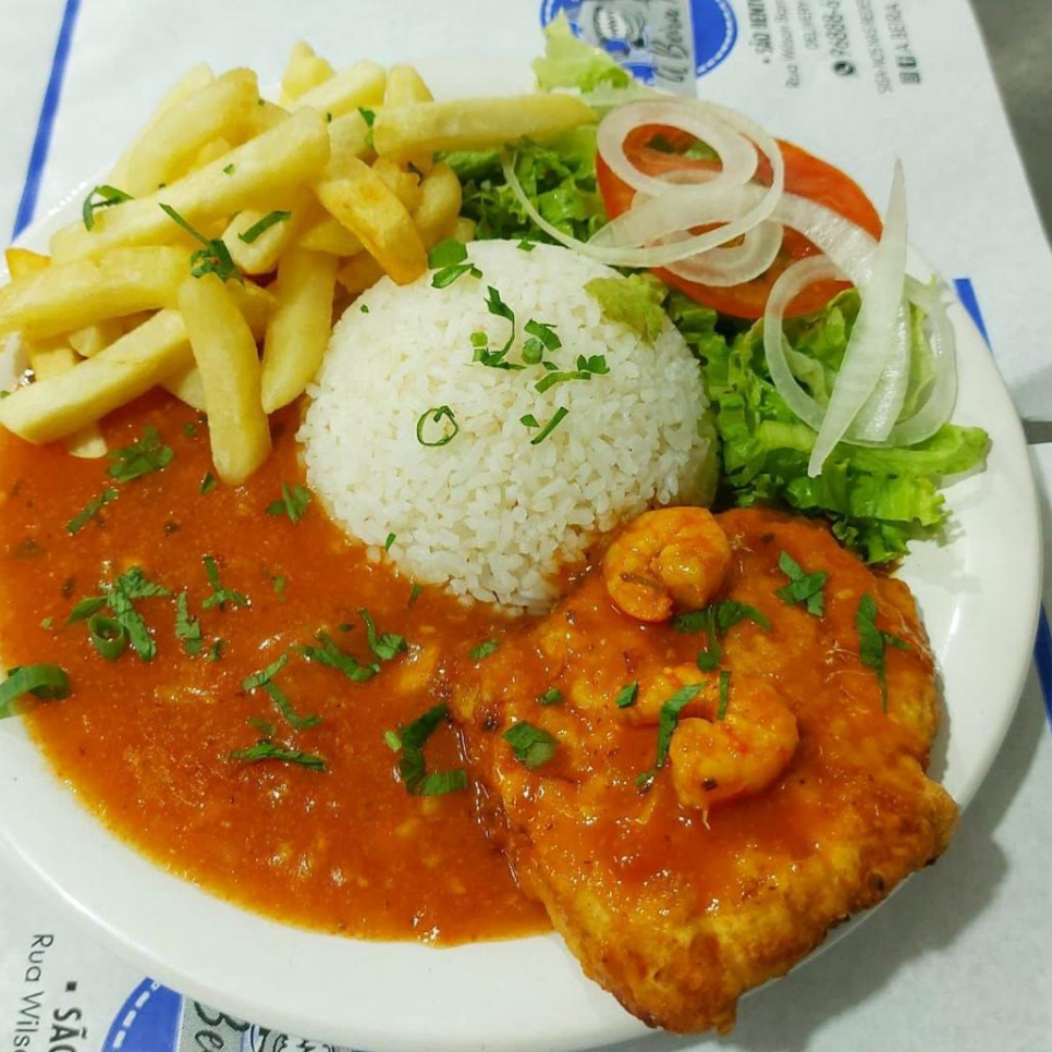Filé de linguado ao molho de camarão, risoto de camarão, pirão salada e fritas ou aipim