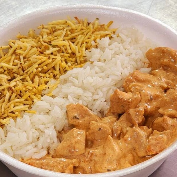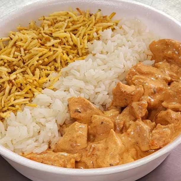 Experimente nosso saboroso estrogonofe de frango com arroz e batata palha!