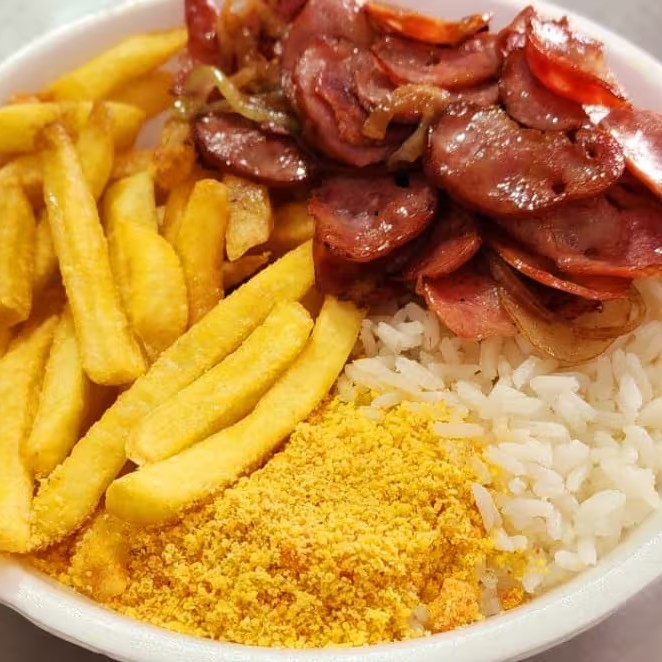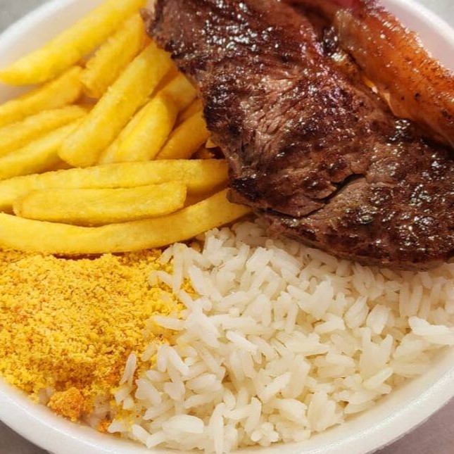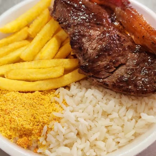 Acompanha arroz; feijão, farofa e batatas fritas!