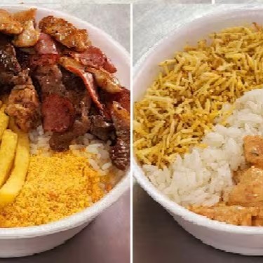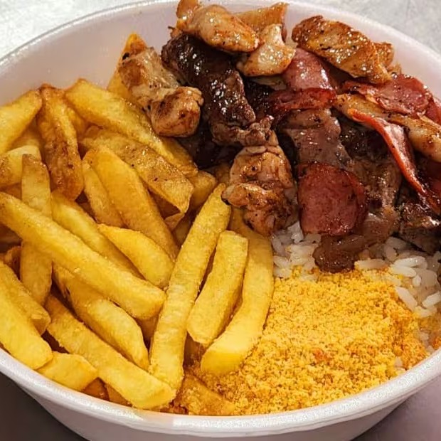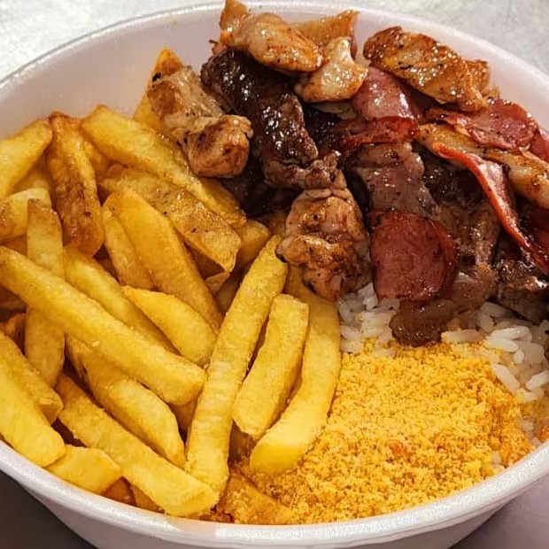 Saboreie uma deliciosa quentinha de churrasco misto composto por tiras de filé de frango; tiras de contrafilé e calabresa fatiada, suavemente temperados e feitos na chapa! :P