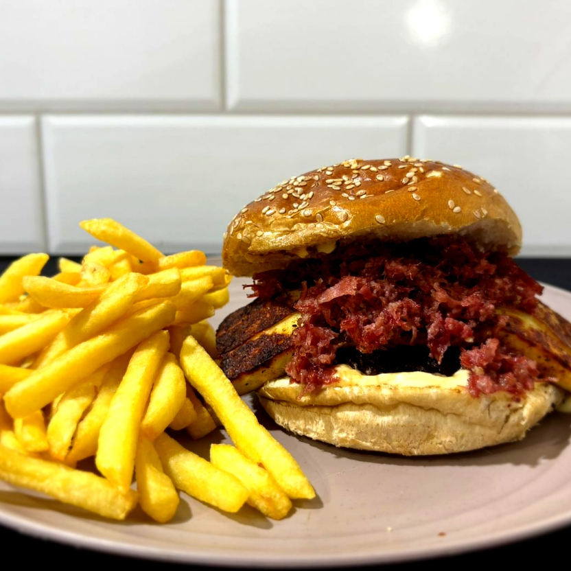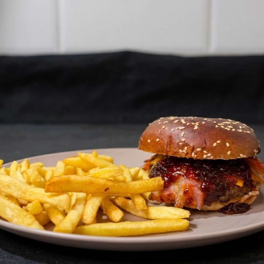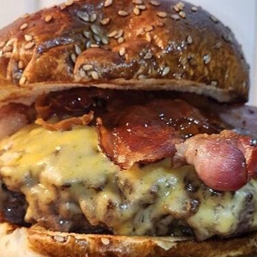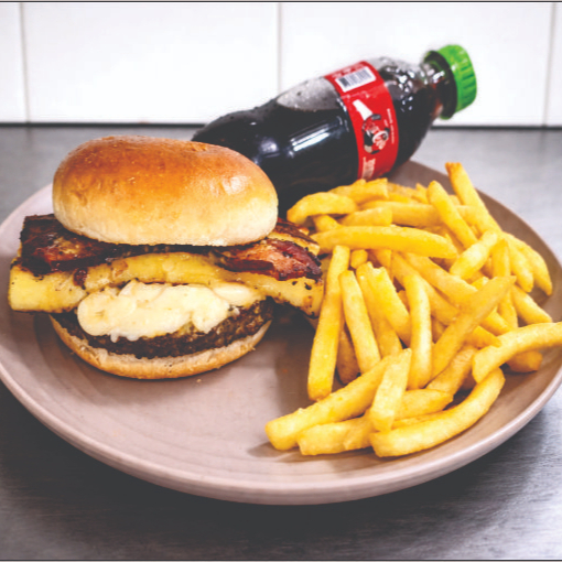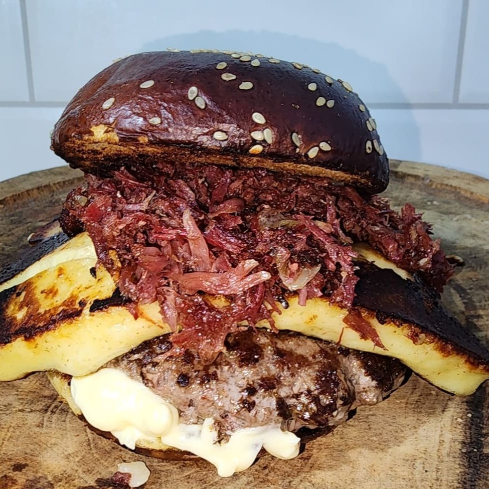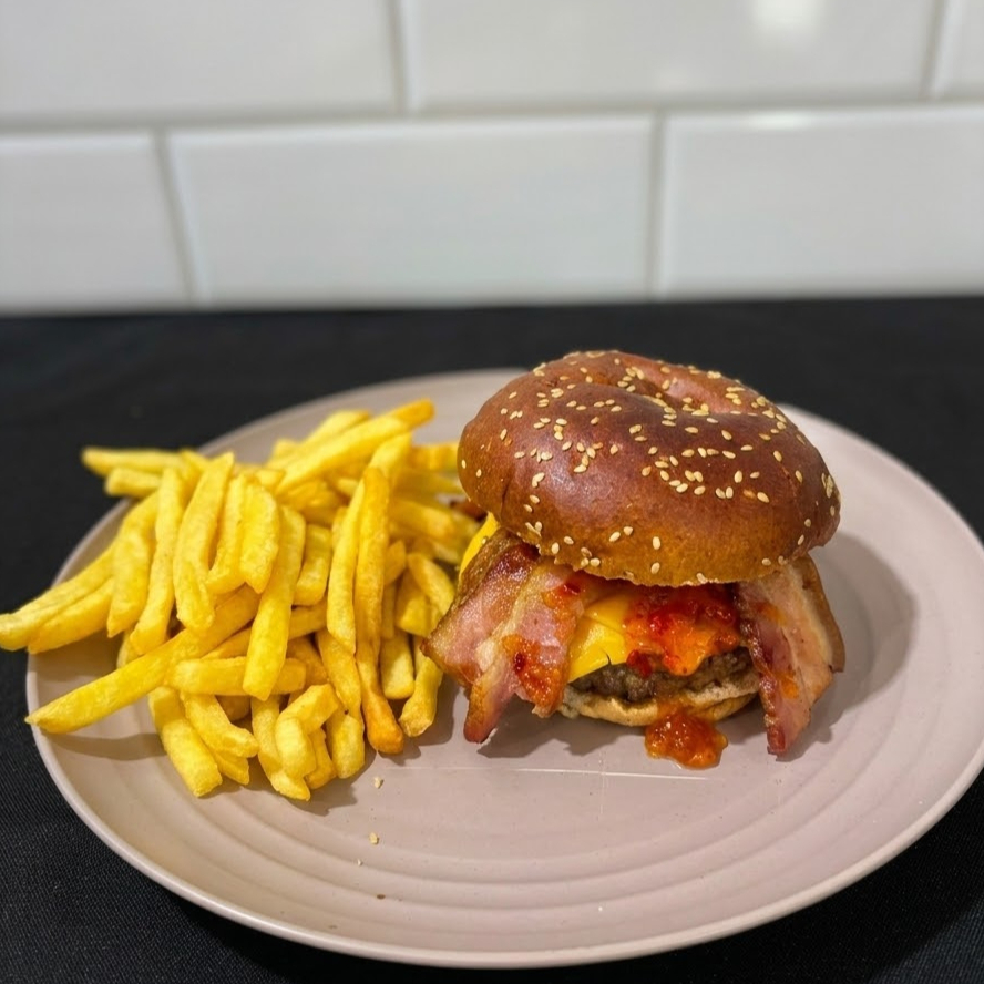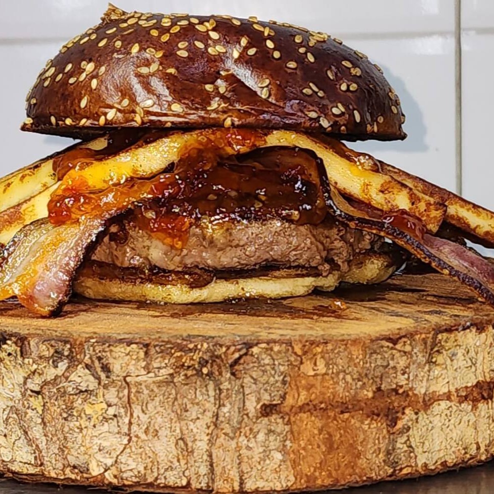 Este hambúrguer traz um suculento blend de 170g de carne Angus, selado no ponto perfeito para garantir maciez e suculência incomparáveis. Para elevar a experiência, adicionamos queijo coalho grelhado, trazendo aquele toque dourado e levemente defumado, além de bacon crocante, que adiciona ainda mais sabor e textura. E para finalizar com um contraste irresistível, escolha entre mel, para um toque adocicado e envolvente, ou geleia de pimenta, para quem ama um equilíbrio perfeito entre doce e picante. Uma combinação única que vai conquistar o seu paladar!