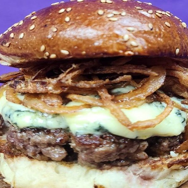 Pão Prime Bun da Bread Makerr, blend 180 gramas, queijo gorgonzola e cebola crispy da casa