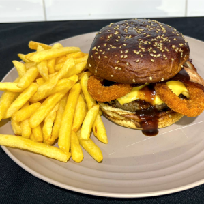 PÃO PRIME BUN + BLEND 170G + QUEIJO PRATO + ANÉIS DE CEBOLA + BARBECUE + BATATA FRITAS