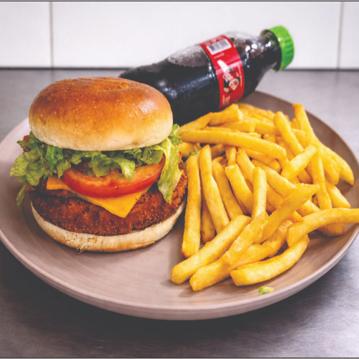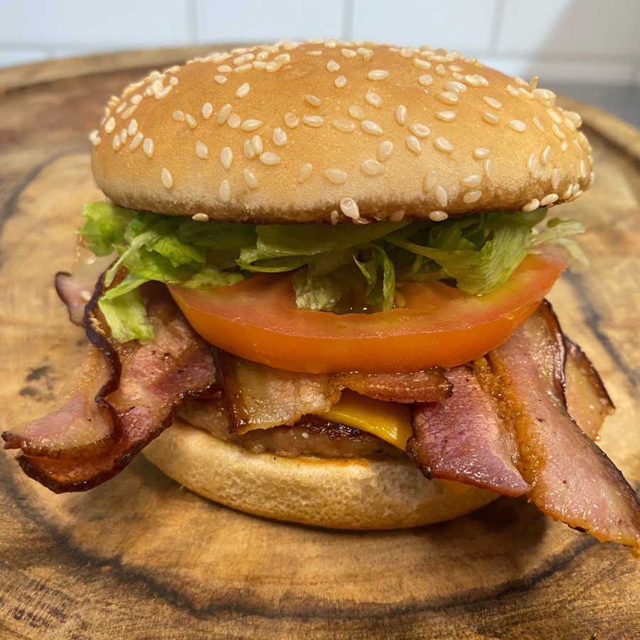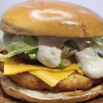 Hamburguer de frango empanado, queijo, bacon, salada e maionese da casa
