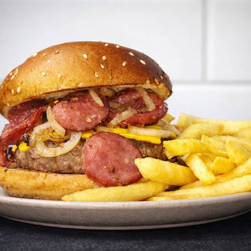 Atendendo a pedidos: Pão prime bun + blend angus + queijo cheddar + calabresa acebolada e por tempo limitado batata frita grátis