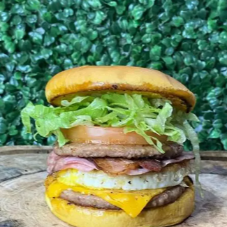 Pão, duas carnes, queijo, ovo, bacon e salada