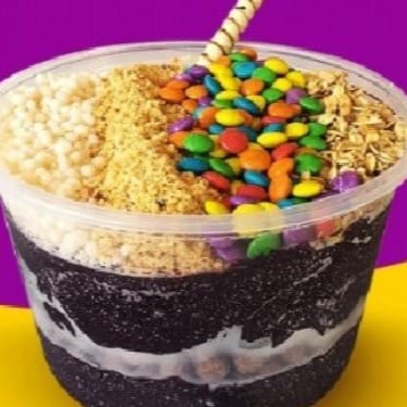 Açai, condimentos, caldas e chantilly tudo inteiramente grátis.