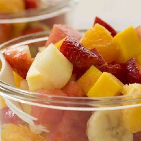 Salada de frutas com abacaxi, banana, morango, uva e manga, acompanhados por creme de leite ou leite condensado.