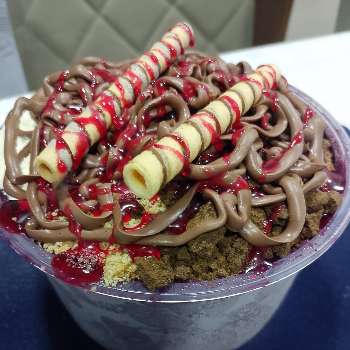 Acompanhamentos gratuitos. Paçoca, amendoim, granola, leite em pó, jujuba, Oreo e ovomaltine. Adicional de Nutella E frutas