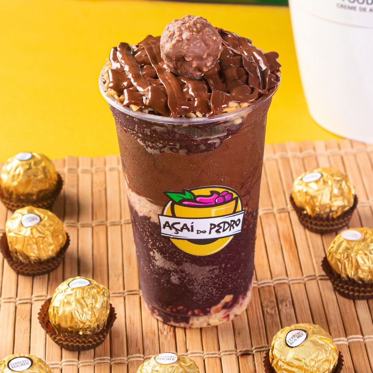 Copo de 550ml trufado de Nutella, duas camadas de amendoim e Nutella finalizado com um bombom ferrero rocher