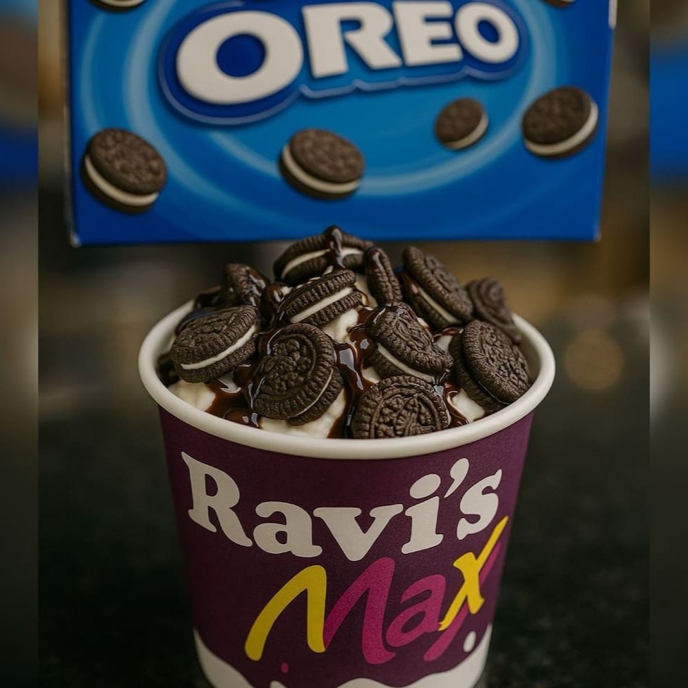 Sorvete de baunilha com uma calda deliciosa e recheio de Mini Oreo que dar água na boca.