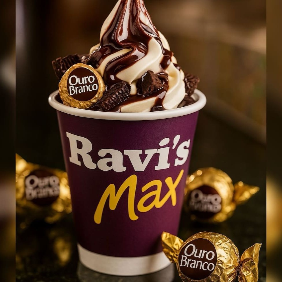 Sorvete de baunilha com uma calda deliciosa e recheio de Ouro Branco que dar água na boca.