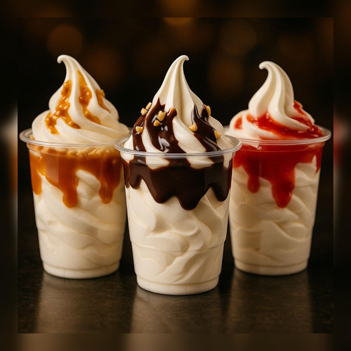 Sorvete de baunilha com frutas extremamente frescas e cobertura opcional a seu gosto.