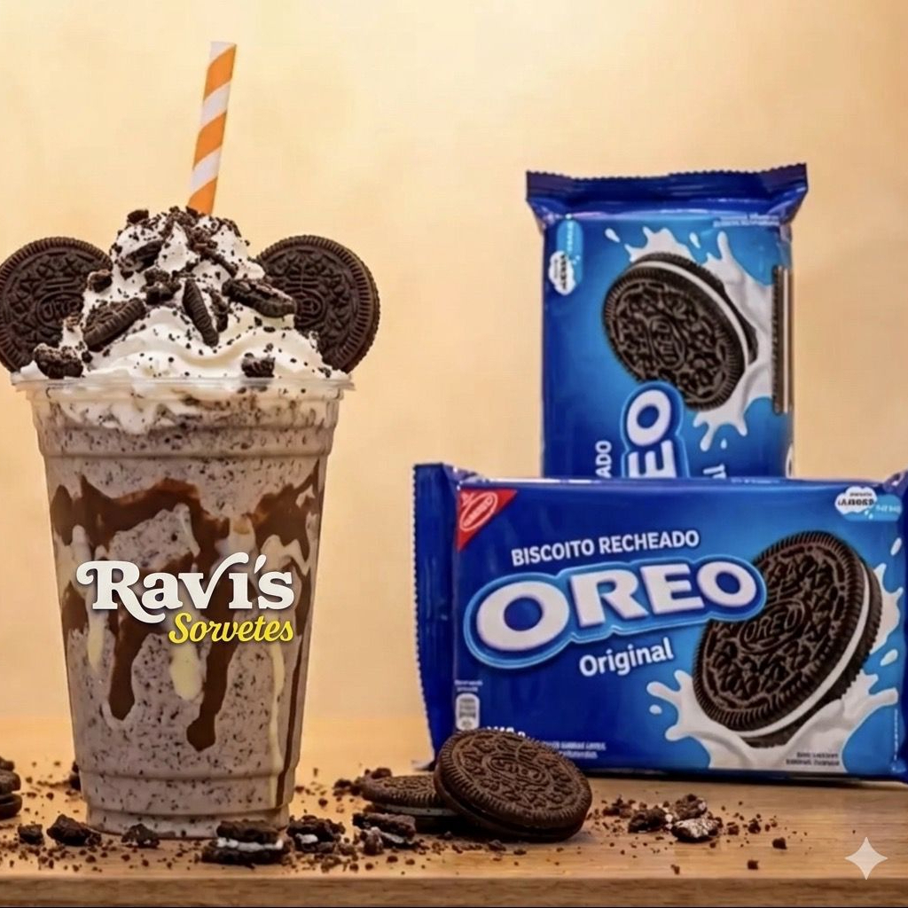 Sorvete de baunilha com uma calda deliciosa e recheio de Mini Oreo que dar água na boca.