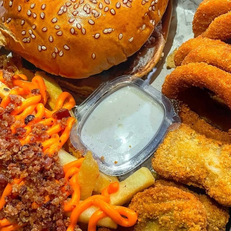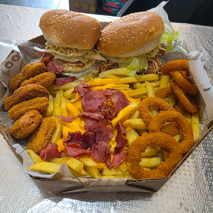 X-Tudo + batata frita turbinada com cheddar e bacon + Steak Chicken e anéis de cebola imagem meramente ilustrativa