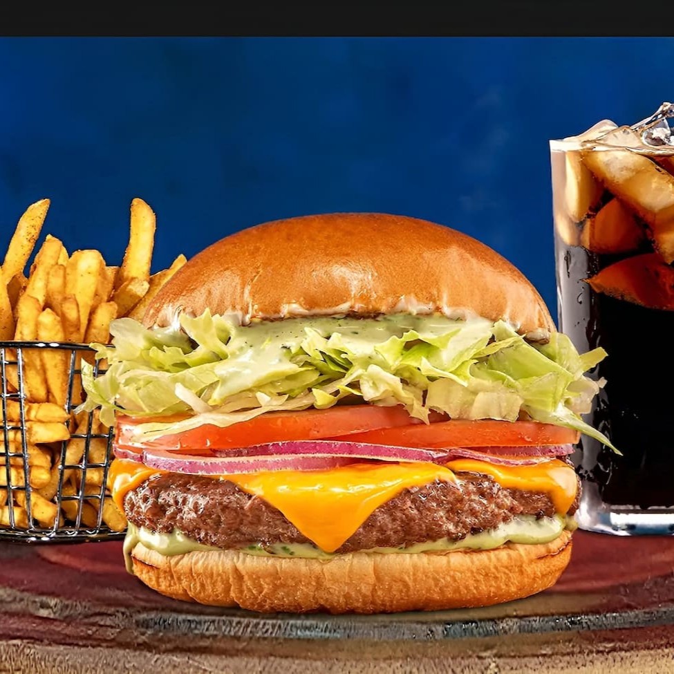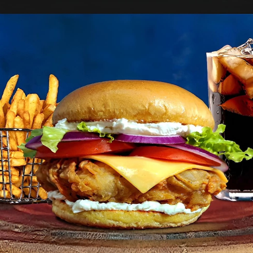 Burgão de Steak Chicken + batata frita individual + refri grátis imagem meramente ilustrativa