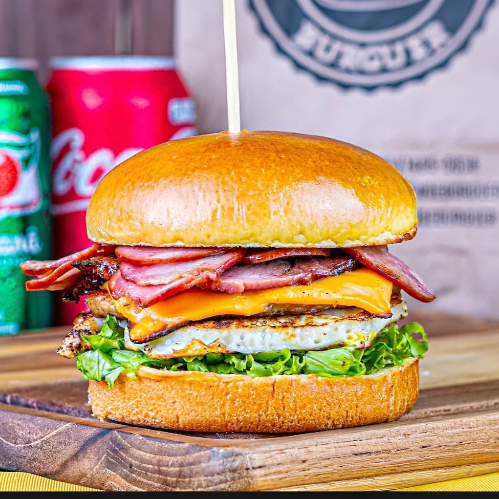 Hambúrguer completo, com carne, queijo, calabresa, ovo, bacon e batata palha imagem meramente ilustrativa