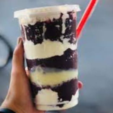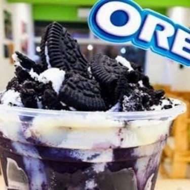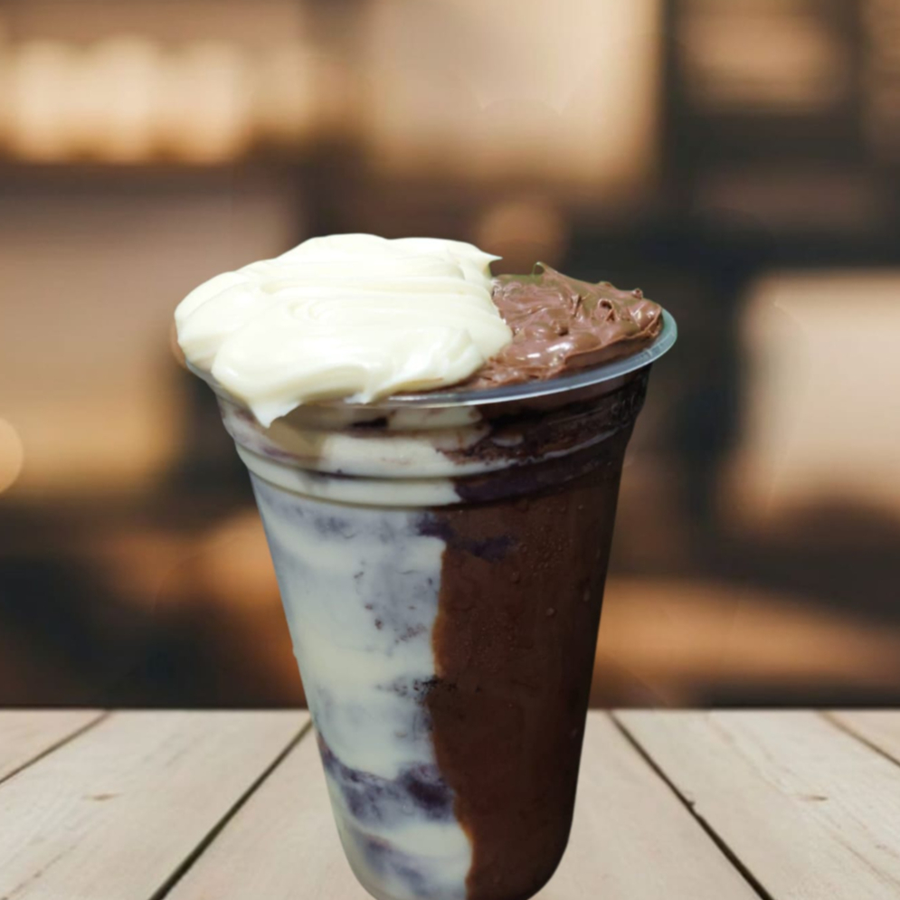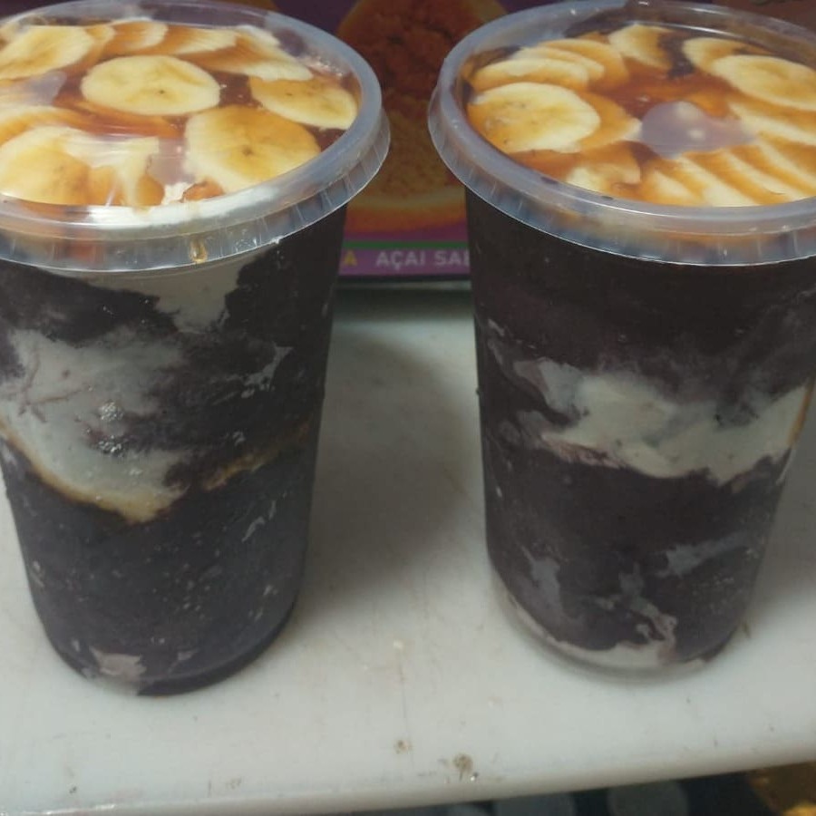 Açai cremoso sabor a sua escolha + Confete + Mini Oreo + Leite condesado + Ninho + Calda a sua escolha dentro do copo. *Obs (os adicionais gratis são adicionados no topo do copo)
