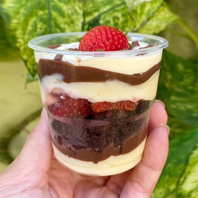 Um delicioso recheio de Ninho, chocolate, brownie, morangos selecionados, chantininho e granulê