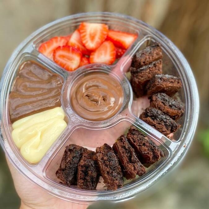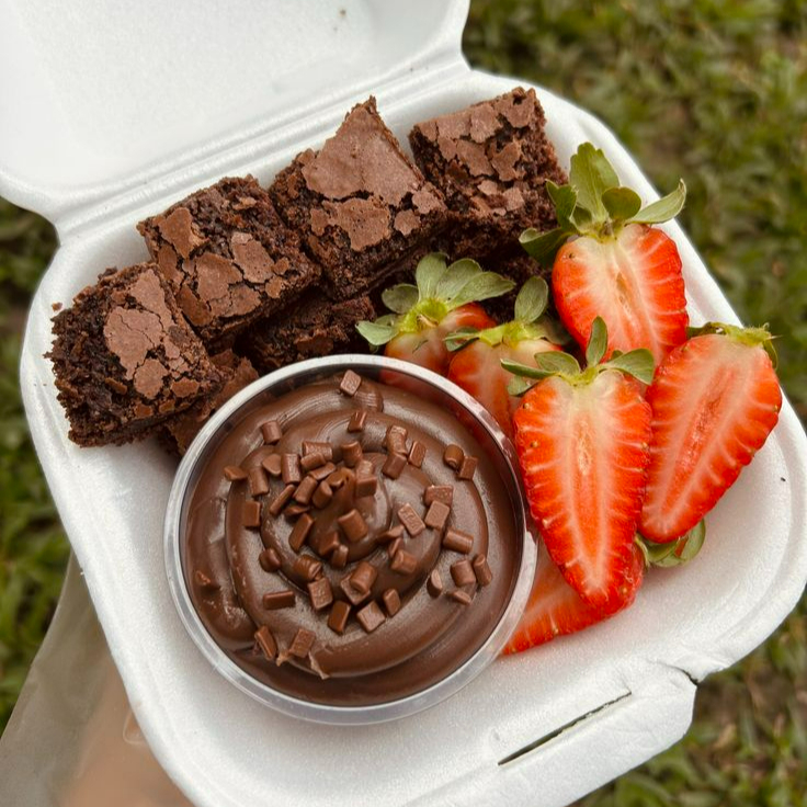 Deliciosa petisqueira com bastante Brownie e morangos selecionamos, para serem mergulhados no recheio de chocolate, Ninho e Nutella.