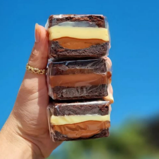 Massa de chocolate molhadinha, intercalada com brigadeiro bem cremoso de chocolate e Ninho
