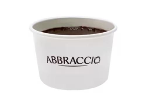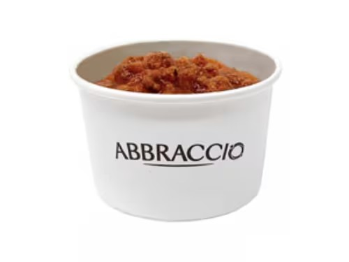 Hambúrguer de polpettone recheado com mozzarella, coberto por mix de molhos caesar e pomodoro e folhas frescas de baby rúcula no pão tipo brioche. Acompanha batata rústica temperada com toque Abbraccio