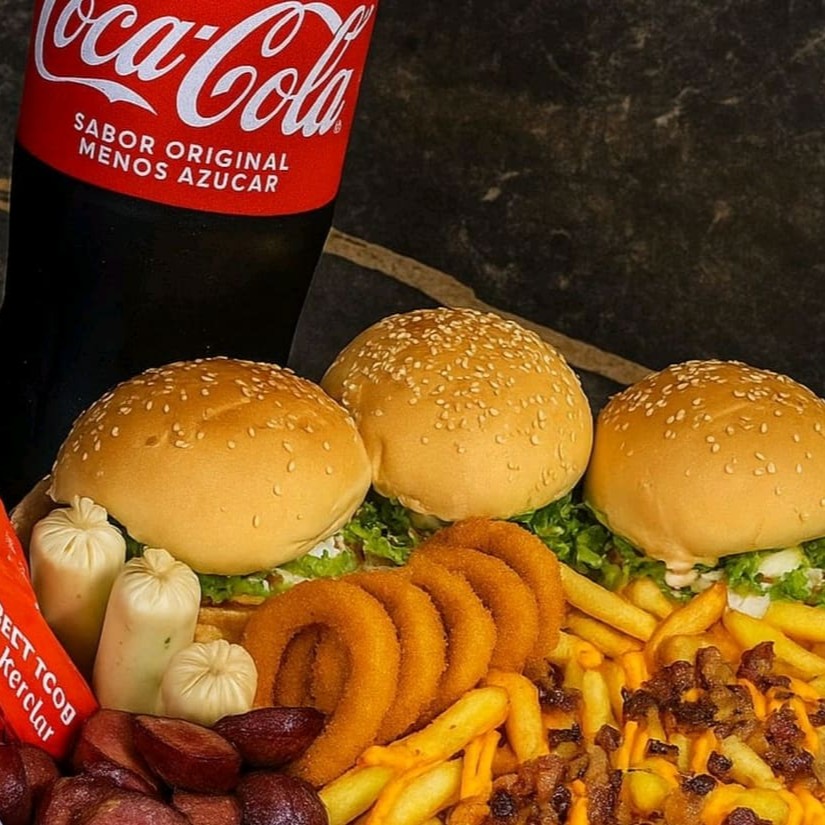 3 X tudos,batata frita,calabresa,bacon picado,6 anéis de cebola,6 nuggets e 1 coca 2 litros