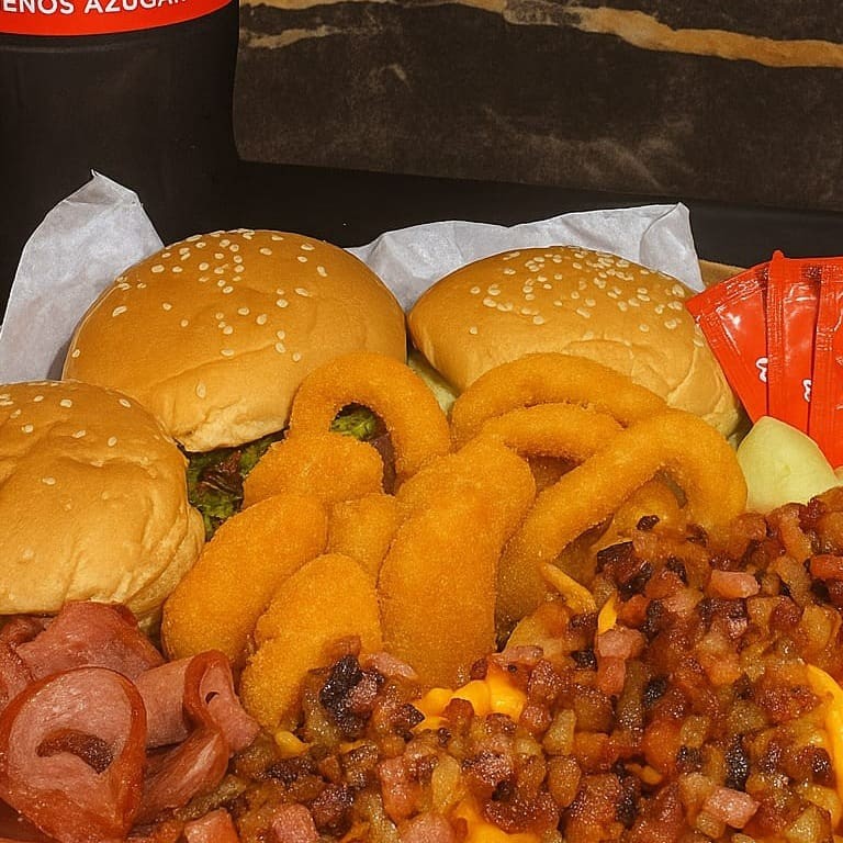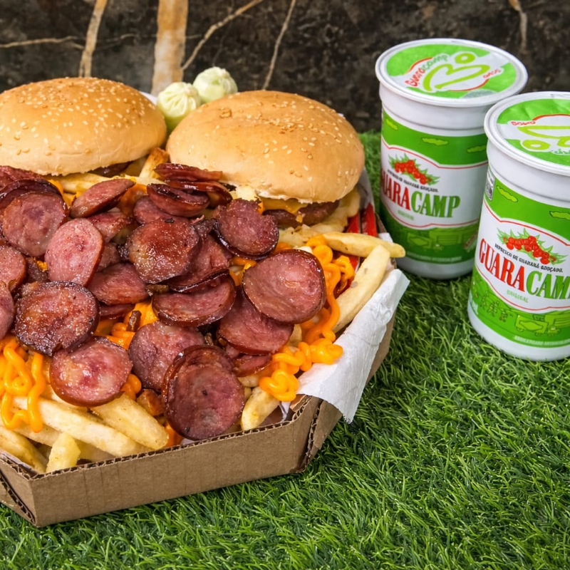 2 Hambúrgueres + 2 Guaracamp's + 2 Batatas- Fritas. Hambúrguer: Pão, Carne, Ovo, Molhos(Barbecue, Billy Jack, Ketchup, Molho Verde), Alface, Batata Palha e Queijo Cheddar.