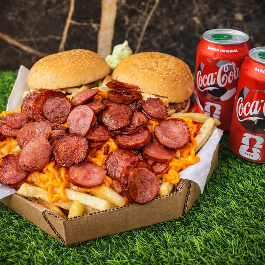 2 X- TUDOS + 2 COCA COLA LATAS + BATATA FRITAS E CALABRESA. X- TUDOSCARNE, OVO, BACON, CALABRESA, KETCHUP, MOLHO VERDE E ALFACE. BATATA FRITA: CHEDDAR E CALABRESA