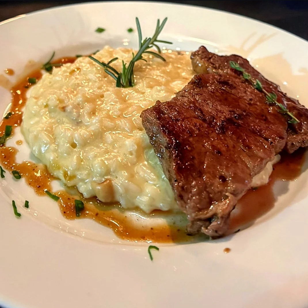 Risoto de limão siciliano ou de queijo com bife à milanesa.