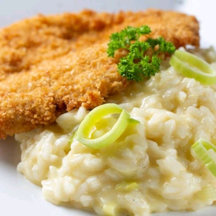 Risoto de limão siciliano ou de queijo com bife à milanesa.