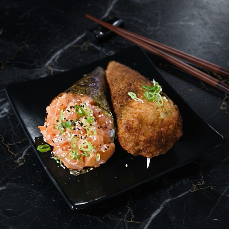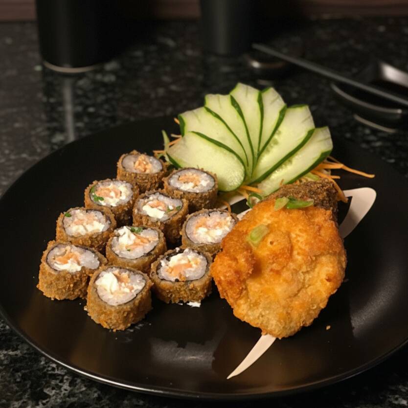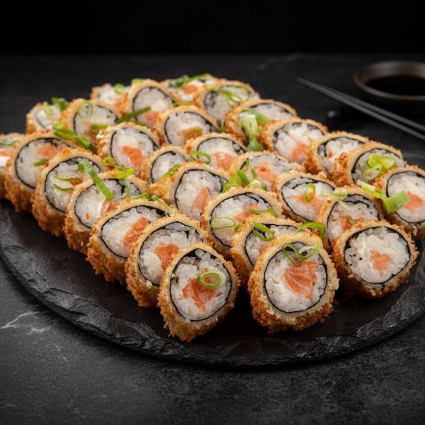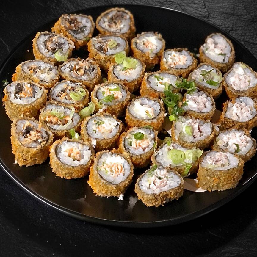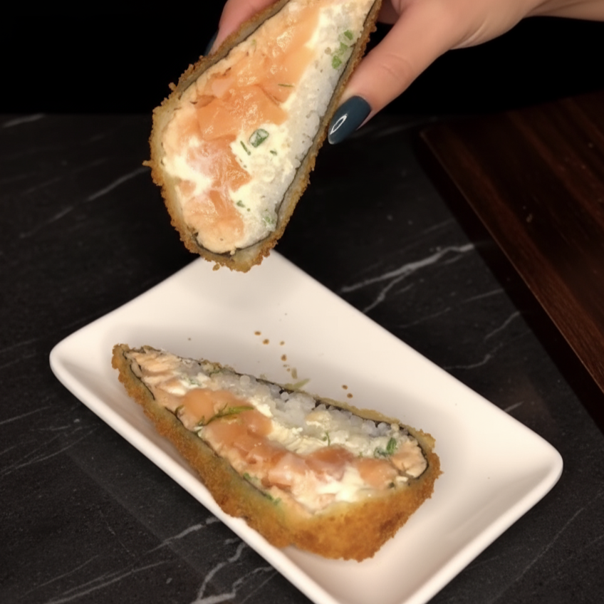 Arroz japonês, nori, cream cheese empanado na farinha panko e recheado com salmão, finalizado com cebolinha e gergelim