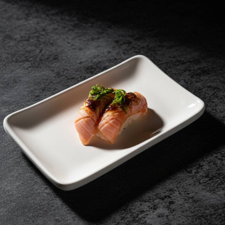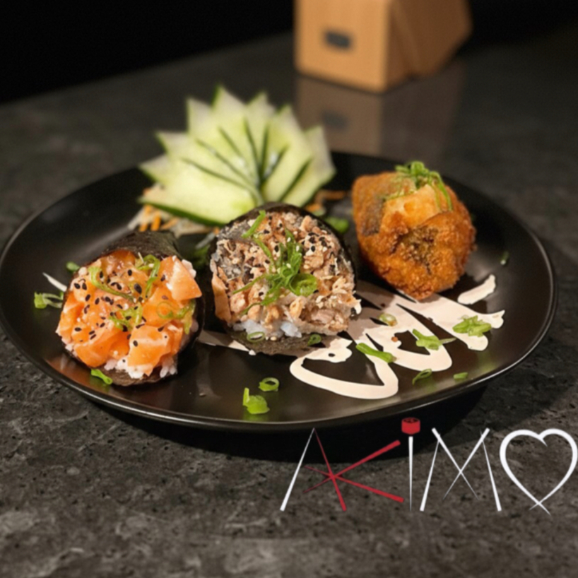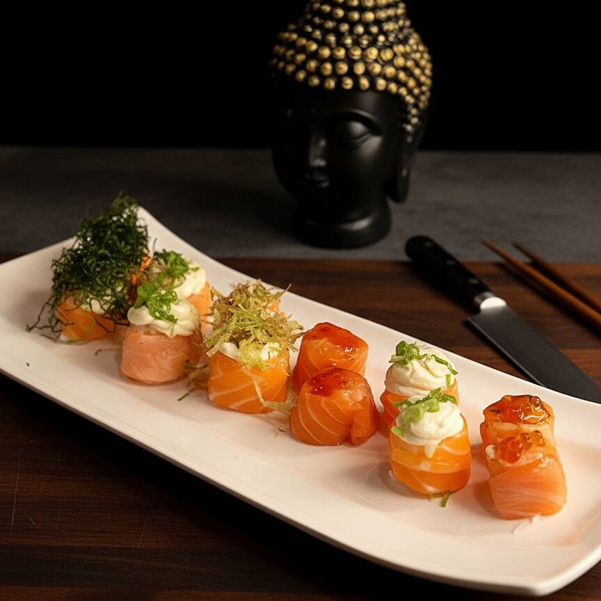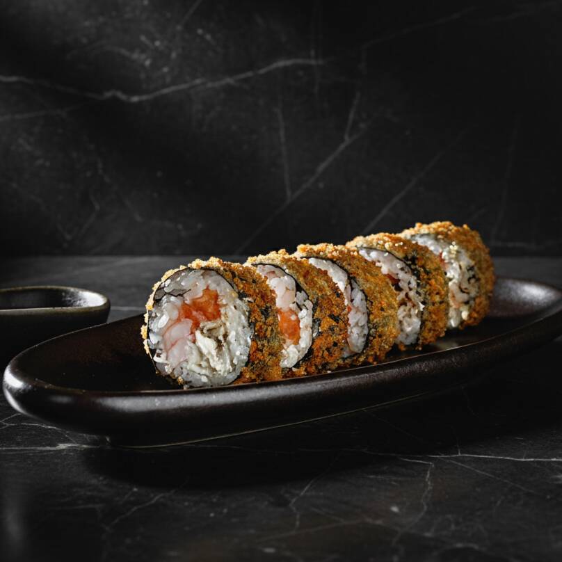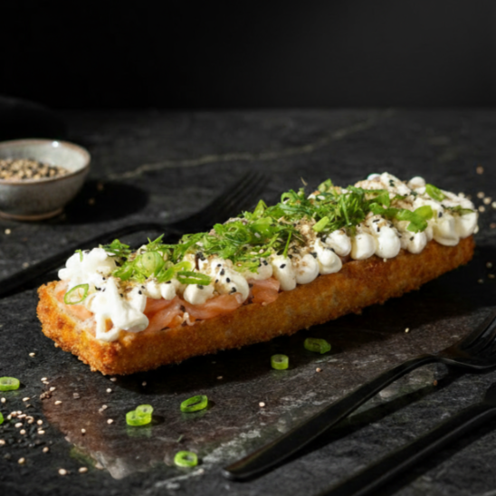 Arroz japonês, nori, cream cheese empanado na farinha panko e recheado com salmão, finalizado com cebolinha e gergelim